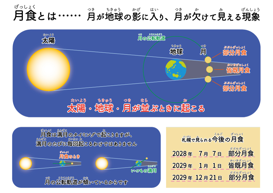 太陽-地球-月が一直線に並んで、月全体が地球の影に入り込むことで、月が赤銅色(しゃくどういろ)に染まって見える現象です。